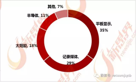PVD鍍膜技術作為制備薄膜材料的主流技術,目前已被廣泛用于制備各種具有特定功能的薄膜材料。在PVD鍍膜材料兩大系列產品中,濺射鍍膜已成為比較主要的薄膜材料制備方法,濺射靶材也是目前市場應用量比較大的PVD鍍膜材料。20世紀90年代以來,隨著消費類電子產品等終端應用市場的快速發展,濺射靶材的市場規模日益擴大,呈現高速增長的勢頭。新思界發布的《2017年PVD鍍膜材料行業投資可行性分析報告》顯示,2016年全球高純濺射靶材市場規模約為113.6億美元,其中平板顯示(含觸控屏)用靶材占比約35%,記錄媒體靶材為29%,太陽能電池用靶材占比為18%,半導體用靶材占比約11%,如圖1所示:
