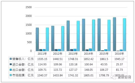 根據(jù)測(cè)算,2016年我國空氣壓縮機(jī)行業(yè)銷售收入為1945.17億元,進(jìn)口總額為25.37億元,出口總額為81.73億元,行業(yè)市場(chǎng)規(guī)模為1888.81億元。