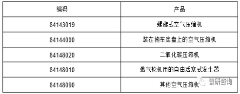 我國空氣壓縮機(jī)在海關(guān)統(tǒng)計(jì)沒有特定代碼統(tǒng)計(jì),主要產(chǎn)品海關(guān)編碼如下表所示: