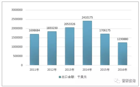 2011-2016年我國空氣壓縮機(jī)出口金額走勢(shì)圖(單位:千美元)
