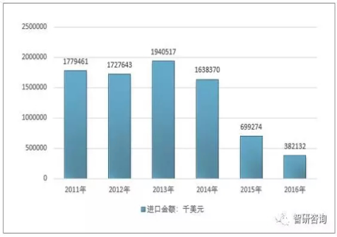 2011-2016年我國空氣壓縮機(jī)進(jìn)口金額走勢(shì)圖(單位:千美元)