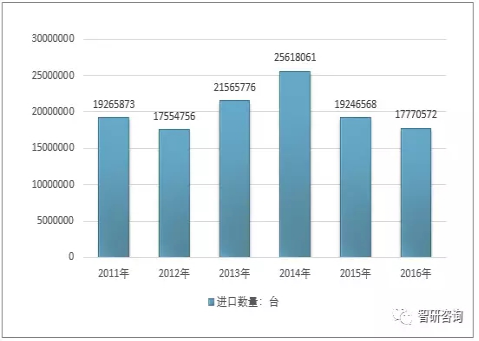 根據(jù)中國海關(guān)統(tǒng)計(jì)數(shù)據(jù)顯示,2016年我國空氣壓縮機(jī)進(jìn)口數(shù)量為17770572臺(tái),較2015年的19246568臺(tái)下降7.7%。